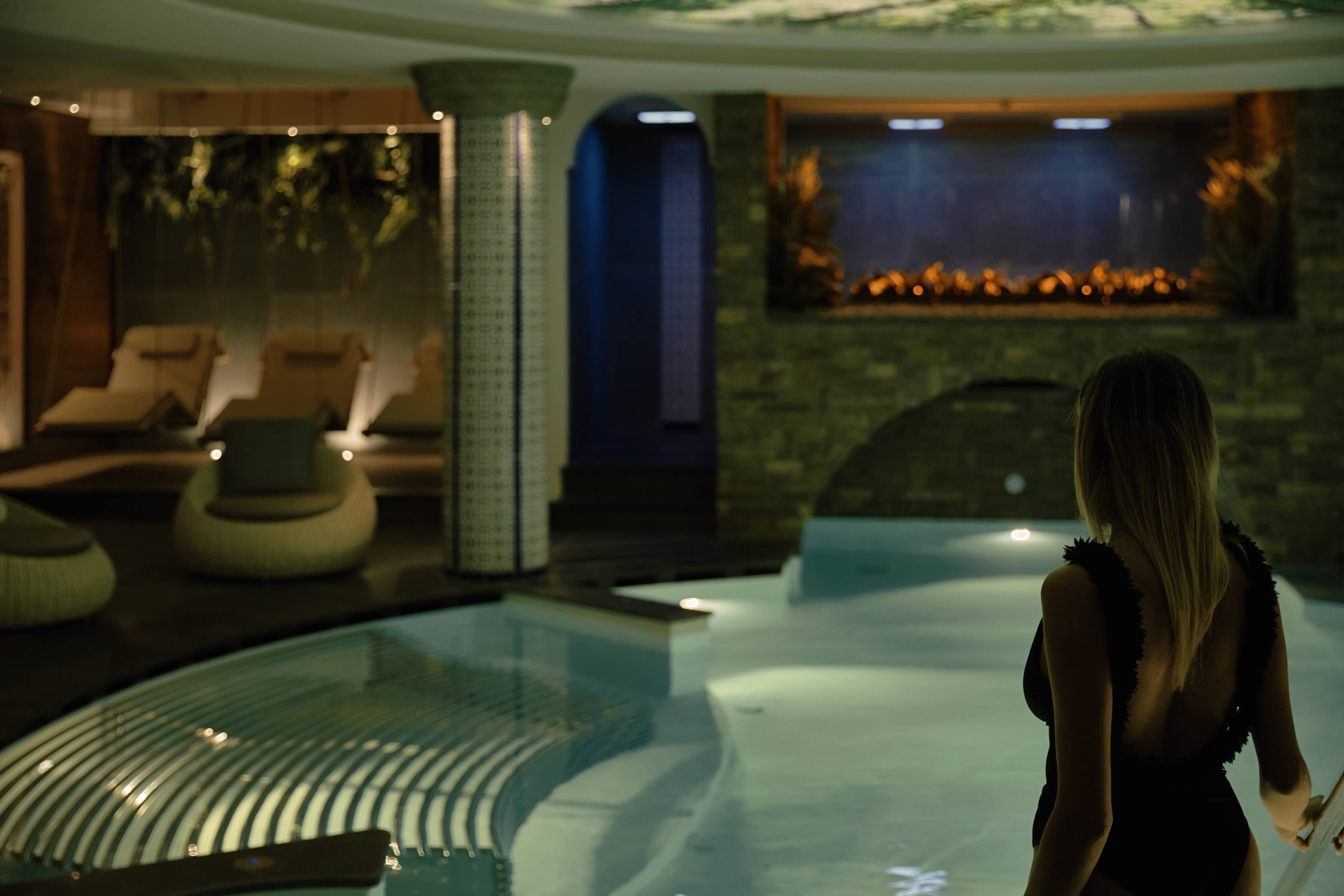 Al centro del Percorso, uno specchio d’acqua riscaldato accoglie il corpo con naturalezza. I getti idromassaggio lavorano in profondità, mentre le cascate scendono lente su collo e spalle, sciogliendo ogni rigidità. La luce si riflette sull’acqua, il silenzio avvolge lo spazio.